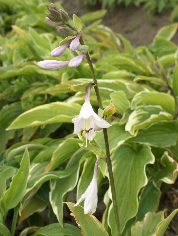 Hosta's zijn decoratieve bladplanten met fraaie trompetvormige bloemen in de zomer. Ze hebben graag een voedzame, lichtzure grond die altijd vochtig blijft. Ze staan graag in halfschaduw of schaduw. De soorten met groen blad verdragen vaak wat meer zon. Klassieke variëtiet met groen blad en witte lran rand. Licht lila bloemen.